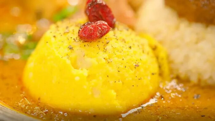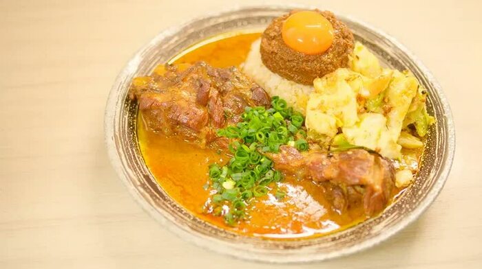 櫻井:すごい。本当に吉田カレーさんでしか見ることができない美しい盛り付けですね。ご飯の上にキーマカレーが乗っていて、さらにその上に卵黄が鎮座してるというビジュアルは、なかなか他ではお目にかかれないですね。ご飯の上のキーマが島国だとしたら、広がるグレイビーは海で、大きな珊瑚礁のように豚が横たわっています。そして魚が泳ぐように青ネギが散らされて、中華アチャールがパラっと砂浜のようなイメージで盛り付けられています。誠に美しいカレーです。