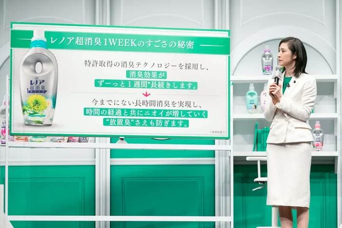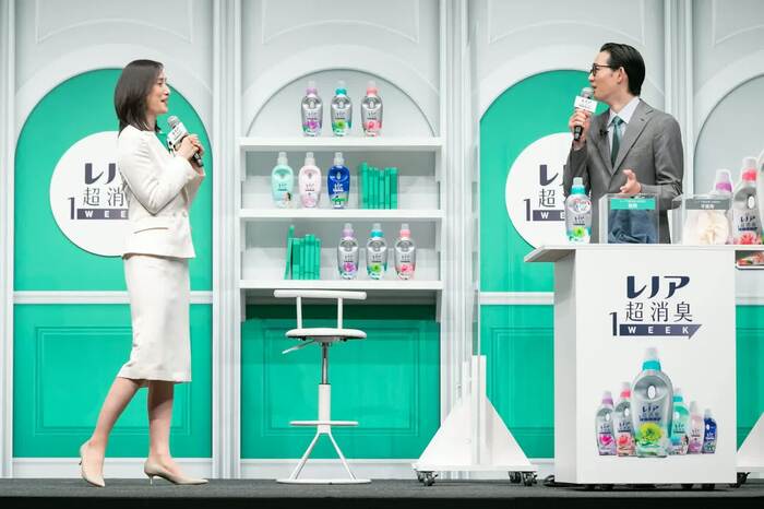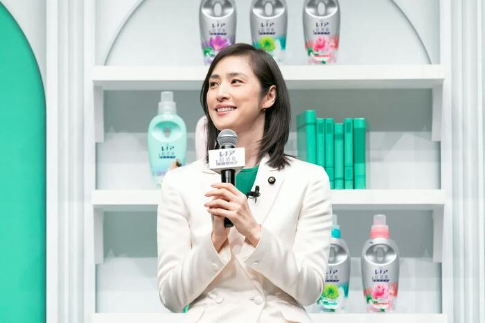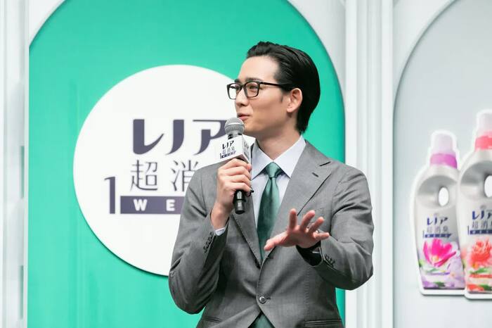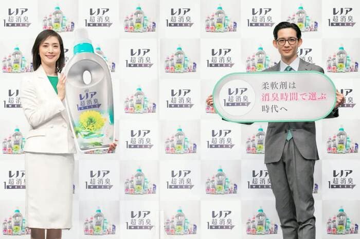 4月15日(木)、衣料用柔軟剤ブランド「レノア」の新製品及び新CM発表会が行われ、CMに「消臭大臣」役として出演する天海祐希と、その「秘書」役の竜星涼が登壇した。