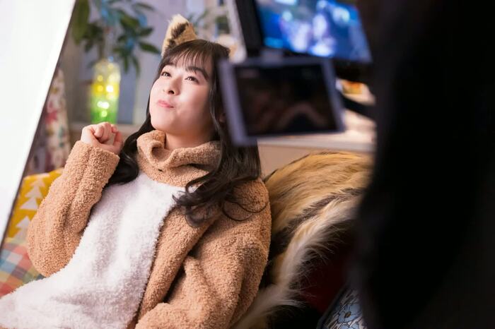 商品パッケージをうれしそうに開けるシーンの撮影では、「笑顔を抑えて、笑顔の加減を10のうち5くらいにしよう」という監督の要望に、少しうっとりとしたような大人っぽい笑顔の演技で応えていく。