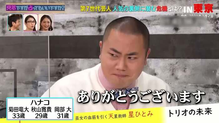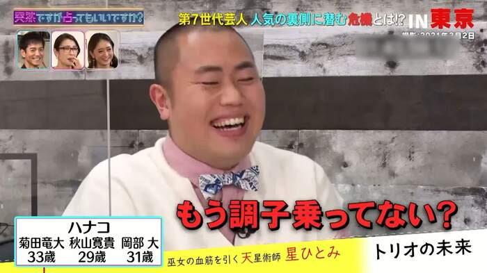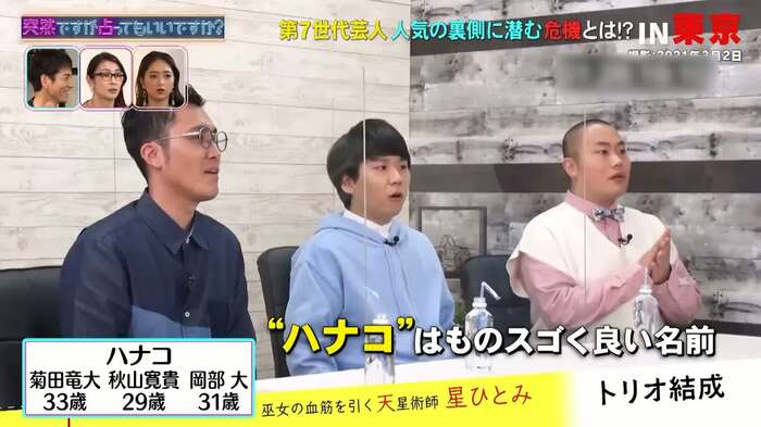 4月14日(水)、フジテレビでは『突然ですが占ってもいいですか?』が放送され、ハナコの3人が星ひとみに占われた。