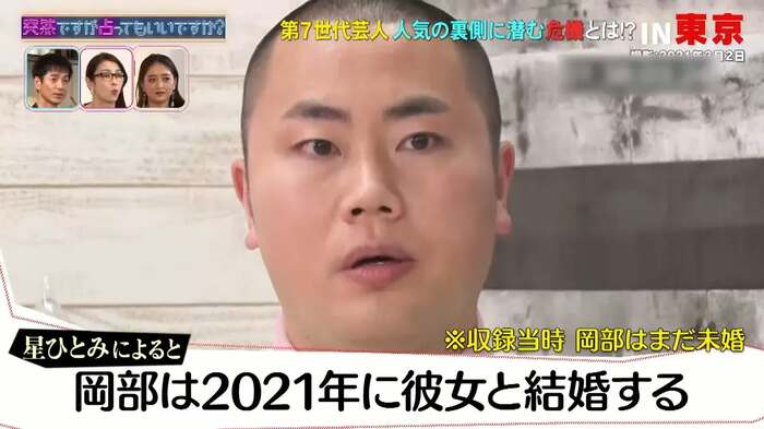 さらに星は岡部について「今年が全ての転機となり、4月に何かが決まる」と診断し、「2021年に彼女と結婚する」と予言。この収録日(3月2日)時点では星の予言について本人から言及はなかったものの、星の見立てのとおり3月23日には結婚を発表した。