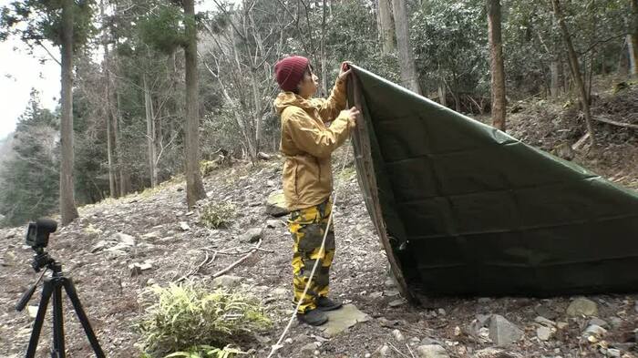 ブッシュクラフト(自然環境における「生活の知恵」)を使い、サバイバル生活を楽しむ、かほなん。放送では、ロープと木の枝、ビニールシートを使いテントを作ったり、木の枝を箸代わりに食事をとるなど、その腕前を披露した。