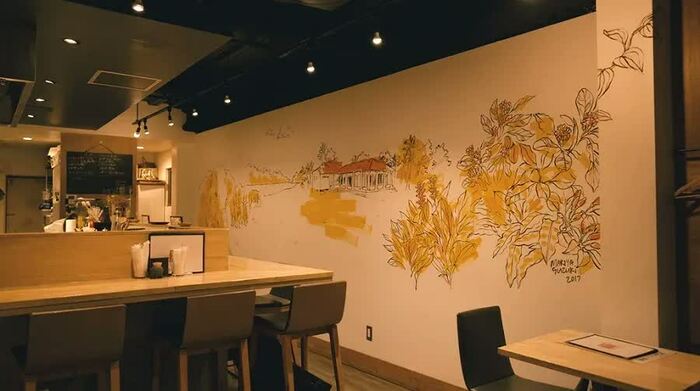チッチ:一面に絵が描いてある壁があります。私はすごく好きです。アートな部分があるお店です。でも、店主さんは、何かのキャラクターみたいだと思いました(笑)。