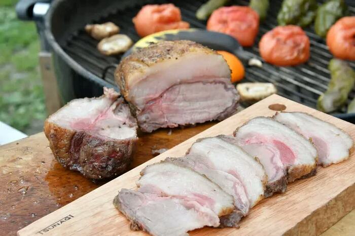 アメリカンスタイルのバーベキューでは、肉は塊で焼いてじっくりじわじわと火を通し、最後に切り分けていく。