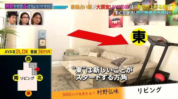 続けてリビングへ。「この部屋は、仕事運はめちゃくちゃ上がります。ただ、孤立する」と村野。まず指摘したのは、ソファの位置と向き。AYAはこのソファに横になって、東の方角に頭を向けて寝ることも多いというが、これについて村野は「東は新しいことがスタートする方角。つまり、いつも仕事のことばっかり考えていることになる」と指摘。AYAは心当たりがあるようで「考えてるかもしれないです」とうなずいていた。