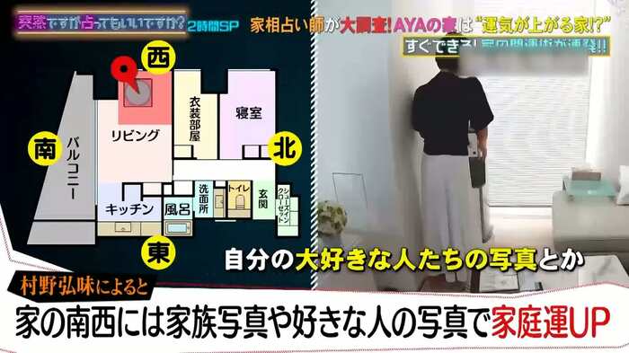 さらに、“家族愛”を表すとされる南西の位置には、ウォーターサーバーが。村野は「ここにサーバーがあると、冷たくなってしまうんです。“冷たい・冷える・水・流す”。家庭運は流れていってしまうし、どんどん冷たくなるんです」と指摘。部屋の南西には、家族の写真や好きな人の写真を置くと家庭運がアップするそうだ。