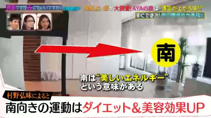 AYAの家庭運を上げるべく、さらに村野がアドバイスしたのが「南」向きの運動。南には“美しいエネルギー”という意味があり、エクササイズやダイエット、化粧は「南」を向きながら行うと美容効果が上がるという。
