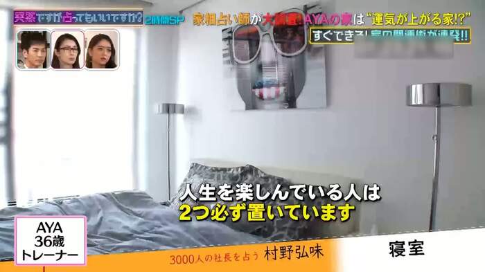 今回の調査の結果、村野はAYAの家について「“隙”をつくることによって家庭運が上がり、今後の人生のターニングポイントが生まれる」と総評。「柔らかい部屋づくりをすること。本当に変わってきますので」と村野に後押しされ、AYAは「はい!わかりました。すぐやります」と意気込みを見せていた。