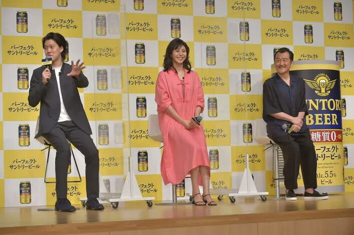 4月7日(水)、「パーフェクトサントリービール」説明会&新CM発表会が行われ、ゲストにCMキャラクターに起用された松嶋菜々子、吉田鋼太郎、霜降り明星・粗品が登壇した。