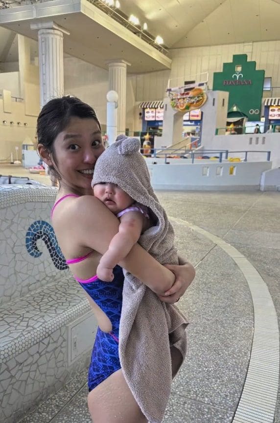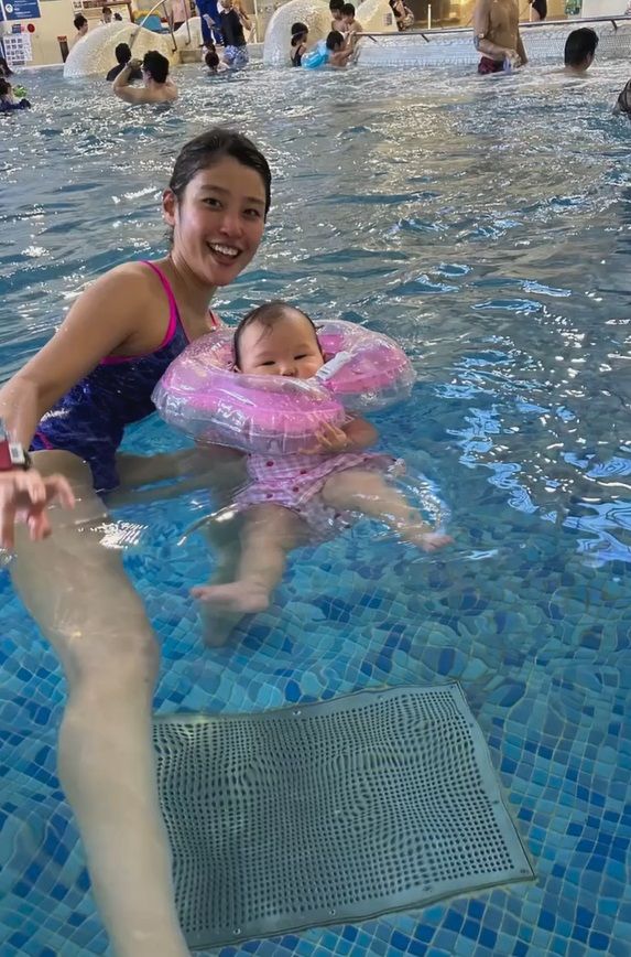 岡副さんは、「先日思い立ってはじめてのユネッサン キャップとゴーグル持参したけど出番はありませんでした笑」と、6カ月になる愛娘と初めてのプールを訪れたことを報告。