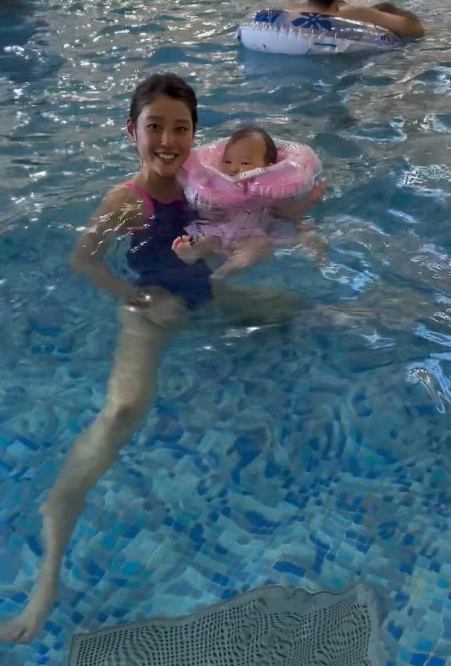 動画には、プールに入り、赤ちゃん用の浮き輪を付けた6カ月の娘を支えながら、青い水着姿の岡副さんや…