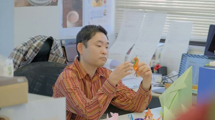 尾石は、折り紙しかしてないように見えますが、それはたまたま変なところばっかり映されているだけで、実はものすごく仕事ができる人だと思っています。だって編集長ですよ(笑)。仕事ができ過ぎて、すぐ終わっちゃうから、余った時間で折り紙をしているんです。そして、デスクの上の折り紙は、実は毎話変わっています。カニとかカブトとかカタツムリとか、いろんなモチーフが出てきます。