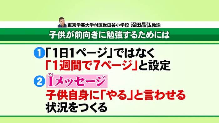 沼田先生は「1日1ページではなく、1週間で7ページというふうに課題を設定して、いつ、何ページやるかは自分で決めさせる」という方法を提案。子供がギリギリまでやらなかったとしても、自分で決めたことには責任を持たせることを積み重ねることが大切だという。