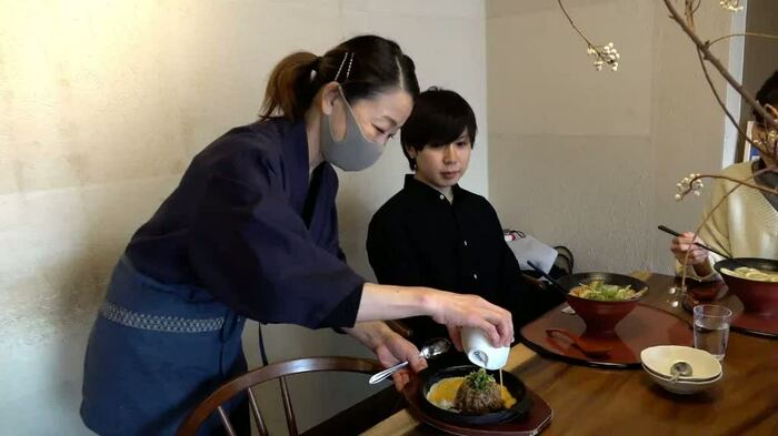 スタッフが「めっちゃ手が震えます」と緊張しながらゴボウを盛り付けると、彼女は「今日はいい!最高」と優しく褒めた。