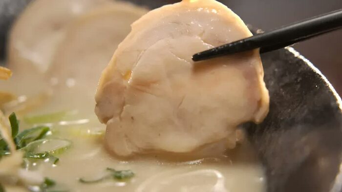 さらに、トッピングは豚ではなく鶏チャーシュー。「胸肉だと、どうしてもパサパサしがちなので、ジューシーさを入れるためにモモ肉と胸肉をコンビにさせる」というこだわり。