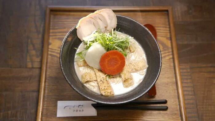 麺処むらじの看板メニューは、塩ベースの鶏白ラーメン。濃厚な鶏白湯スープと喉越しのよいストレート麺がよく絡む1杯だ。さらに、特製の酒粕を使い京野菜を添えた酒粕ラーメンや、レモンの酸味と濃厚スープの相性がやみつきになる檸檬ラーメンも人気を集める。