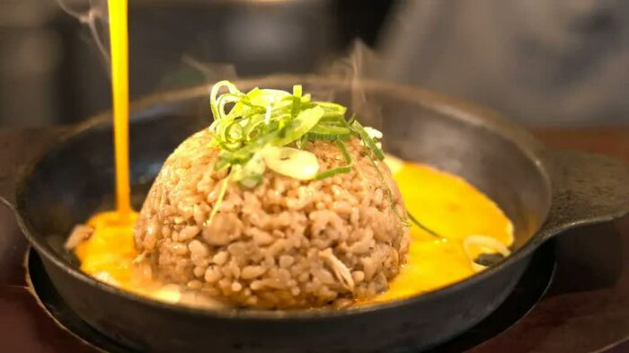 麺処むらじでは、ラーメンと同じくらい人気のサイドメニューがある。その名は“目の前で混ぜるチャーハン”。熱々の鉄板に卵を落とし、お客さんの目の前で混ぜていく。