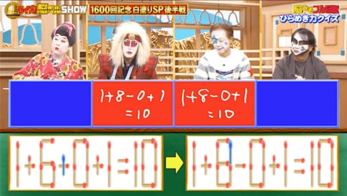 正解はまず、真ん中の「+」から1本を動かし「-」に。その1本を「6」に足して「8」にします。そうすれば「1+8-0+1=10」となり、正しい式になりました。