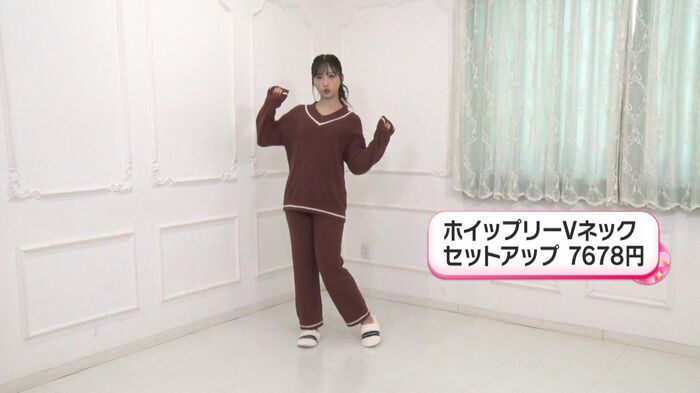 1つ目はチョコレートをイメージしたカラー「ホイップリーVネックセットアップ」。V字ネックで首回りをすっきり見せられます。