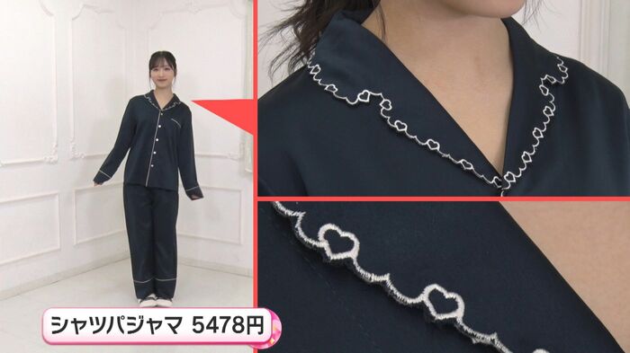 2つ目は、ハートをモチーフにした「肌側起毛サテンハートシャツパジャマ」。控えめなハートモチーフの刺しゅうがされていて、甘すぎないさりげなさが味わえる定番のシャツ型パジャマです。