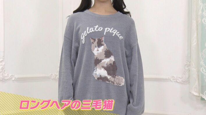 なめらかな柔らかさのニット素材を使っているため、リラックスしやすくなっています。フロント部分にはロングヘアの三毛猫が大きくデザインされているので、ネコ好きには必見です。