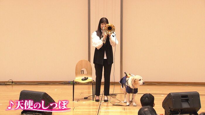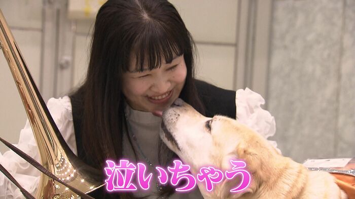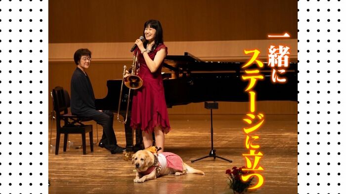 盲導犬アリエル9歳と一緒に生きる、全盲のトロンボーン奏者の山岸加奈子さん。
