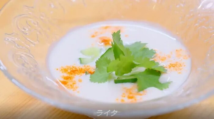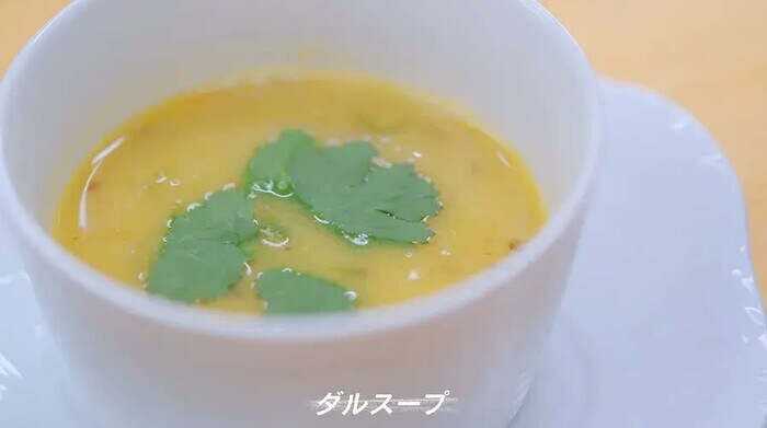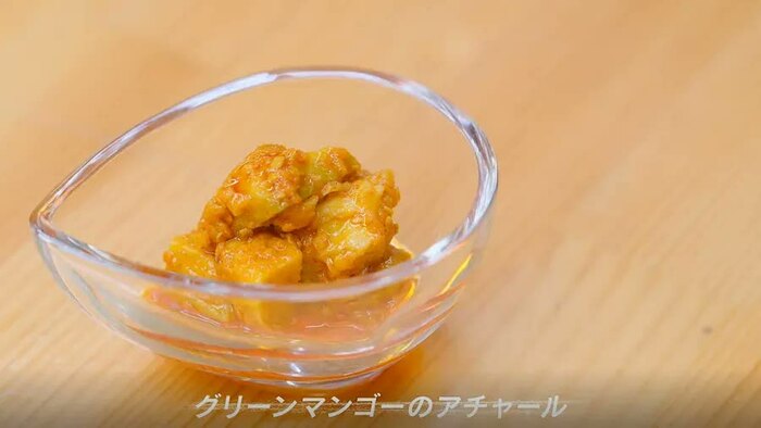 瀬島さん:白いのは、ビリヤニのお供、「ライタ」です。もう一つは、「ダルスープ」で、豆のスープです。あとは、「グリーンマンゴーのアチャール」です。これは、結構塩辛いです。