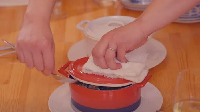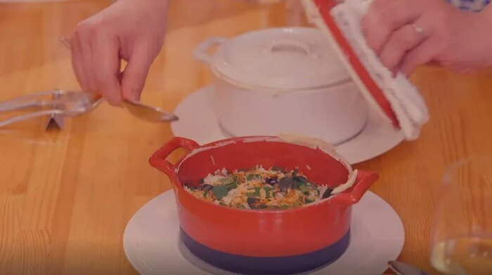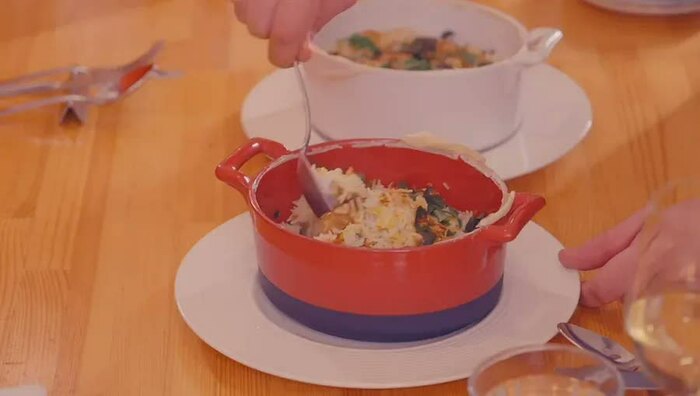 瀬島さん:一食ずつココットを使います。カレーソースとご飯を層にして、そこからさらに加熱する手間をかけています。酸味付けには、ヨーグルトとプラム。インド西部やパキスタンで使われる乾燥プラムなんですが、独特な酸味とエキゾチックな香りがするものになります。