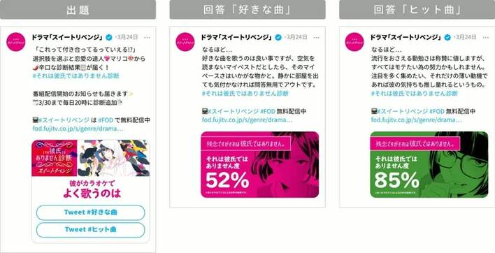 『スイートリベンジ』の主人公・恋愛の達人である社長マリコが今までの調査実績を駆使し、彼氏指数を診断するドラマの世界観をリアルにイメージした診断コンテンツをTwitter・Instagramで展開。