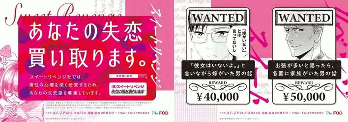 ドラマに登場するスイートリベンジ社の稼業は、オトコに酷いフラれ方をしたオンナから依頼を受け、“同じ痛み”をオトコに与えて復讐すること。そこで、男性の心理を深く研究するため、あなたの失恋話を買い取り、ドラマの世界観をリアルに体感できる企画を実施。