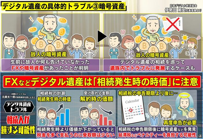 生前に個人が何も告げていなかったFXや暗号資産があったことが判明し、デジタル遺産の相続をめぐって遺族内でトラブルに発展するケースもあるといいます。