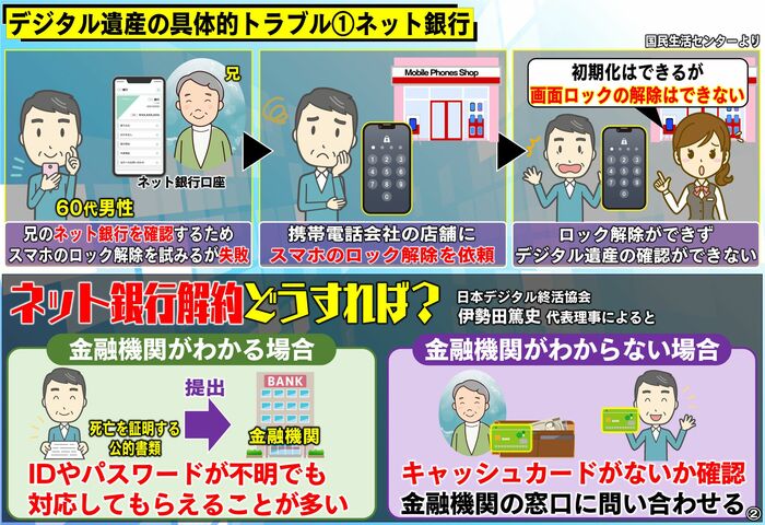 日本デジタル終活協会・伊勢田篤史代表理事によると、亡くなった人が利用していた金融機関が分かる場合は、死亡を証明する公的書類を金融機関に提出することでIDやパスワードが不明でも対応してもらえることが多いといいます。