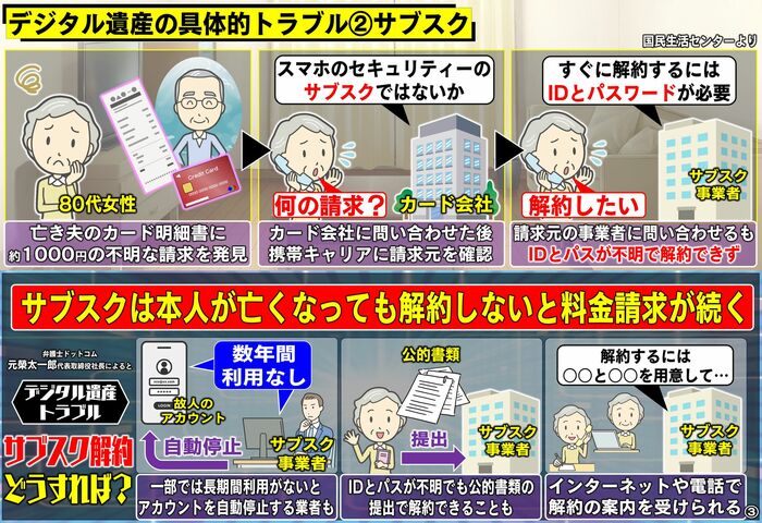 基本的にこういうサブスクは本人が亡くなっただけでは解約されなくて、ずっと契約が続いているので、延滞料金が発生してきたりします。ID・パスワードが分からない場合は死亡診断書とか戸籍謄本みたいなものを提出して解約することができます。