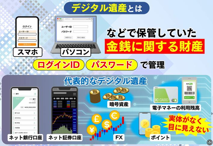 ログインIDやパスワードで管理されており、代表的なものは「ネット銀行口座」「ネット証券口座」「暗号資産」「FX」「電子マネーの利用残高」「ポイント」など…