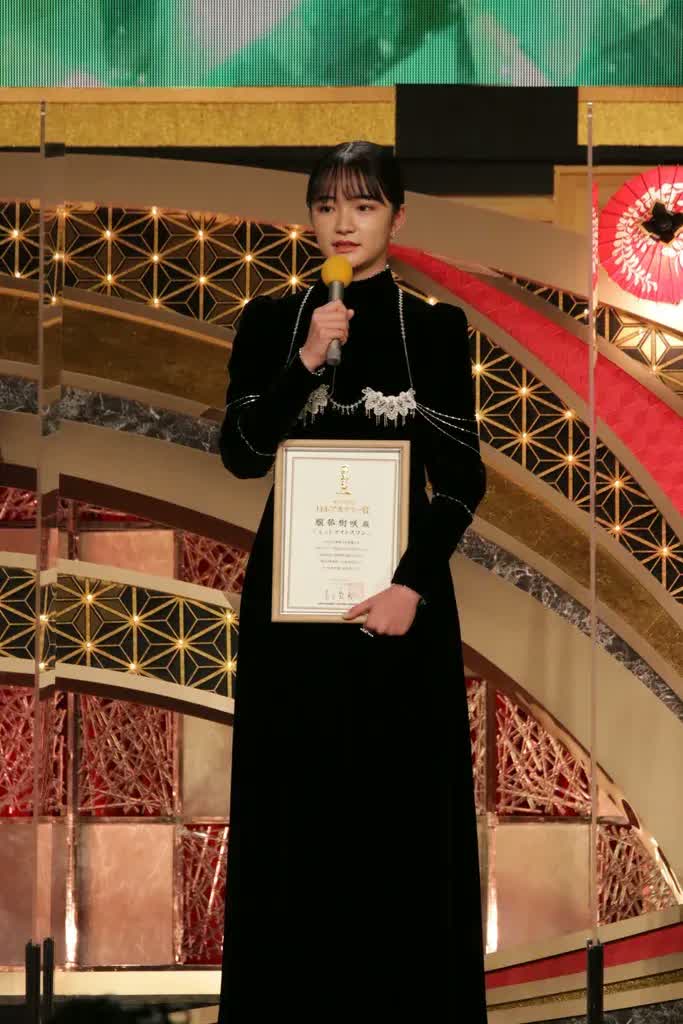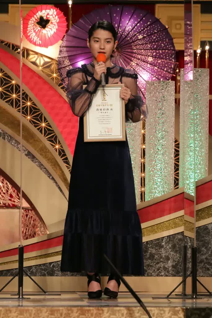 蒔田彩珠です。このたびは、このような素敵な賞をありがとうございます。今まで、この舞台に沢山の先輩方が立っている姿を、テレビ越しに見ていて、いつか私も立てたらなと思っていました。今日こうしてここに立てていることが、本当にうれしいです。