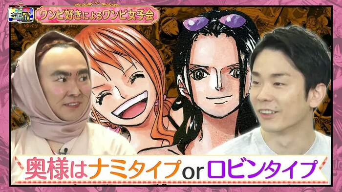 「女友達にしたいのはナミ?ニコ・ロビン?」というお題では、女子の意見が割れるなか、みちょぱから「かまいたちの奥様は、ナミタイプ?ロビンタイプ?」という質問が。