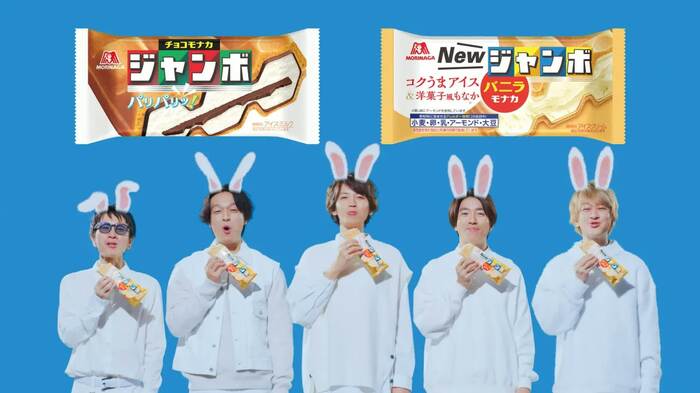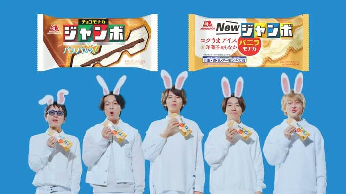 「チョコミミ」篇は、関ジャニ∞メンバーが全身白の衣装で登場。今回新たに“チョコミミ”がついたバニラモナカジャンボを、チョコではなくウサギのミミを頭に付けて紹介する。「アイスケース」篇は、チョコモナカジャンボとバニラモナカジャンボのどちらを買おうか悩む横山に対し、メンバーが二手に分かれて誘惑して…という内容になっている。