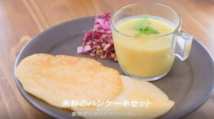 本日の料理 2品目「米粉のパンケーキセット(聖護院大根のポタージュカレー)」