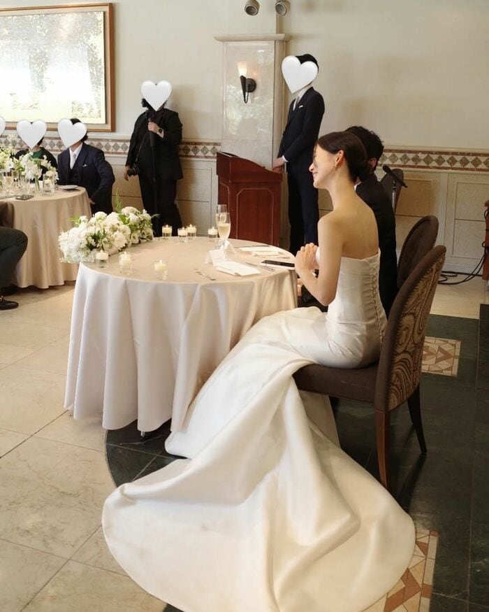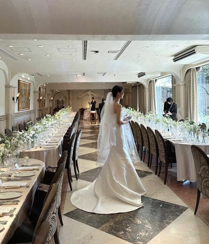 他にも準備が整った披露宴会場を見て感動しているというショットも公開。憧れていたという縦長のテーブルにはたくさんの白い花が飾られていました。