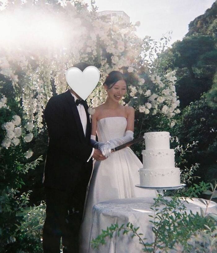 加えて、パールがちりばめられた3段の真っ白なウエディングケーキを旦那さんと一緒に入刀する場面も。どこかエモく感じられるこの写真はフィルムカメラで撮影したそうで「この質感がたまらないです」と気に入っているとのことでした。