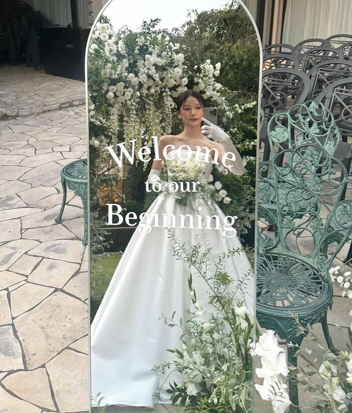 さらに、12月1日には式場の様子やウエディングケーキなどを紹介。「Welcome to our Beginning」と書かれた全身鏡の前で、ウエディングドレス姿の朝日さんがスマホで自撮りをしており「全身鏡と鏡に貼ってあるシールはネットで購入して、自宅に届けて自分で貼りました!」と明かしています。