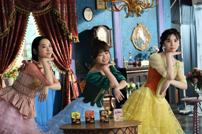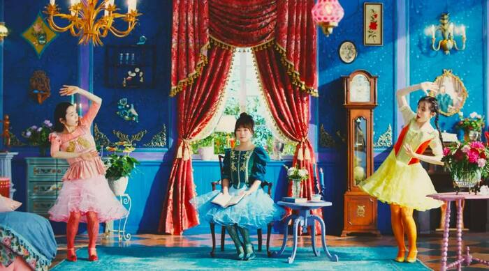 撮影が行われたのは昨年の冬。厳重な感染症対策がされた中、東京近郊のスタジオに作られた三姉妹の部屋は、キュートかつゴージャスな雰囲気に設えられていた。映像映えしそうなビビッドな色味と、かわいらしい家具や小物の数々。伊藤らの艶やかなドレスと相まって、絵本の中に入り込んだような世界観だ。