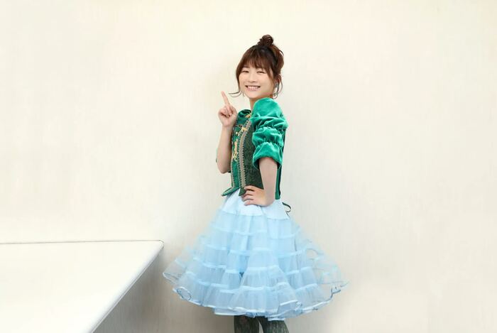 私、こんな風にフワッとなっているスカートが大好きなんです。子どものころに女の子の絵を描くときでも、ウエストがキュッ、スカートがフワッとしたものばかり描いていました。その憧れが詰まったような衣装で、本当に全部気に入っています。