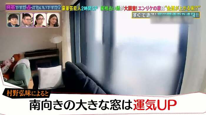 続けてリビングへ。村野は日当たり良好な家相を褒めただけでなく、「南向きの大きな窓は運気アップ」と指摘。実際に、エンリケの部屋には南向きに大きなガラス窓が取りつけられていた。