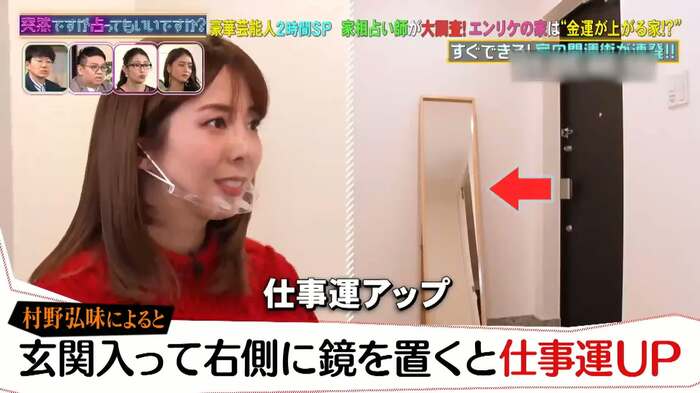 まずは玄関をチェック。「玄関に入って右側に鏡を置くと仕事運がアップ&人間関係が良好に」「玄関に高級品を置くと運気アップ」という村野。これは実際にエンリケの自宅でもすでに取り入れられており、「たまたまなんですけど…(笑)」と嬉しげだ。