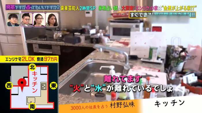さらに2人はキッチンへ。若干散らかったままの状態を見た村野は「家がキレイなほうが、断然、運気が上がります!」と断言。また、占い上で“火”をあらわすコンロと“水”をあらわすシンクが「少しでも離れていると運気がアップ」するそうで、実際にエンリケ宅のキッチンではコンロとシンクが離れた位置に。「元々の家の作りの都合だけど、よかった!」というエンリケだったが、村野は「たまたま選んだ物件がいい人は、運がいい人なんです」と納得の正論で返していた。