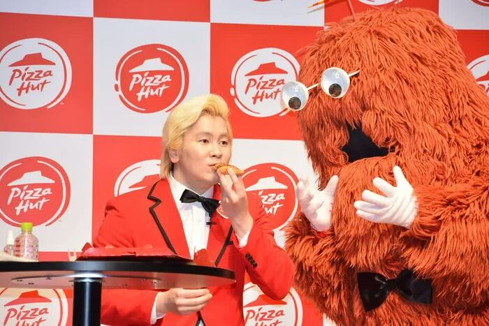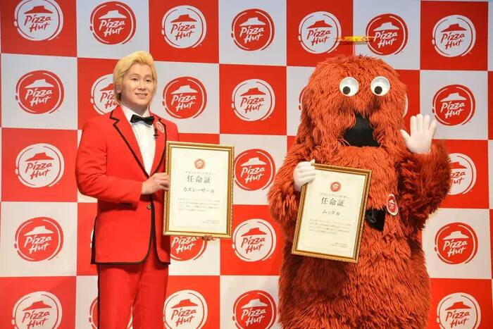 3月8日(月)、日本ピザハット株式会社が展開する「ピザハット」のブランドアンバサダー就任と新CM発表会が開催され、メイプル超合金のカズレーザーとムックが登壇した。