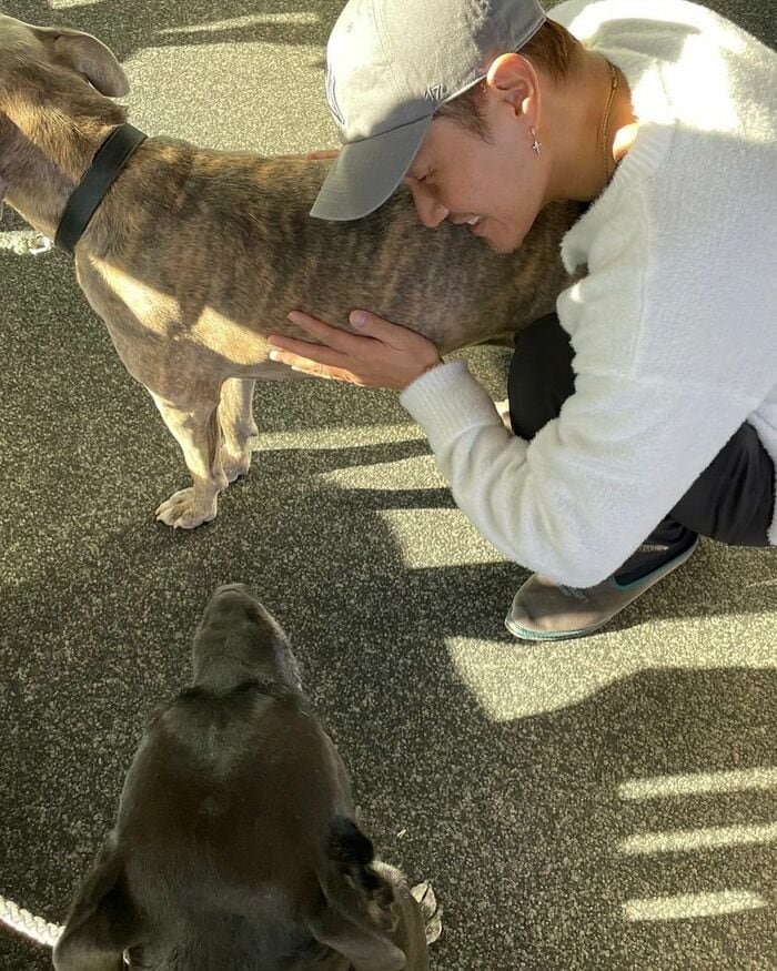 ATSUSHIさんの友人夫婦に案内してもらったというロッジで、2匹の犬と笑顔で戯れている姿も公開!