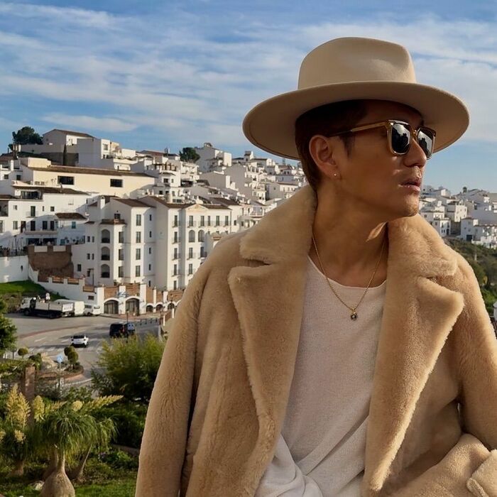 スペインでは、真っ白な建物が印象的なフリヒリアナを訪れ、その街並みを背景にベージュのボアコートとハットをかぶったATSUSHIさんがポーズを決めているショットも。