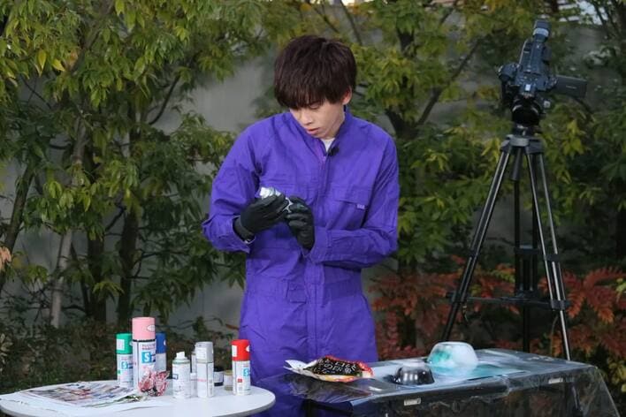 続いて、リョウガの手元にはスプレーが。「動画サイトを徘徊しまくっていたときに“おすすめ”で出てきたんですけど。僕が“これ”をやるような印象はないじゃないですか?だから気になってますね」という一芸をセレクト。ユーキから借りたジャージを着て一芸を練習している様子も紹介される。